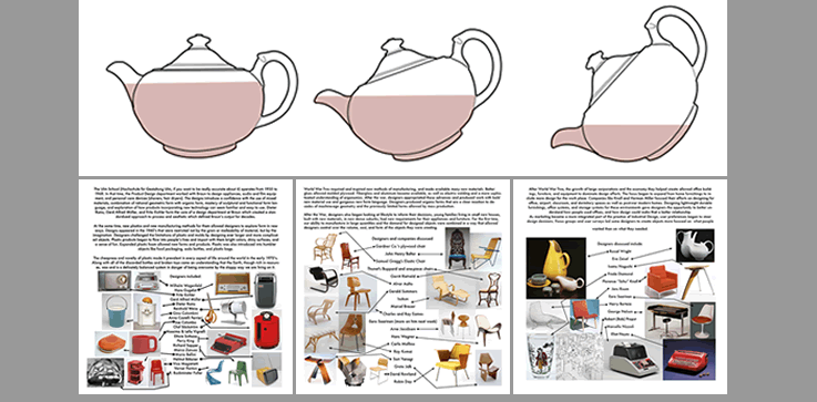 I have been developing a set of tools to help run the class. Summaries of each lecture provide an archive of ideas and details discussed, and examples of images used. Other digital tools bring objects to life; utilitarian objects were designed to consider use, which is hard to understand from photographs alone.